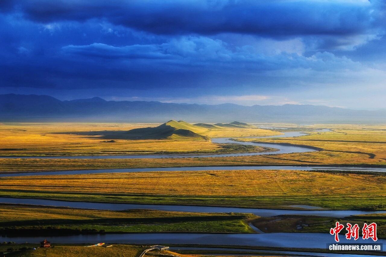 黄河9直第1湾。黑玛多凶 摄黄河从巴颜喀推山奔流而去正在广袤的若我盖干天酿成1个年夜年夜的归湾搁眼视来茫茫草本取丝带般的黄河融为1体“降霞取孤鹜全飞,春火同少天1色”的意境正在此完备浮现