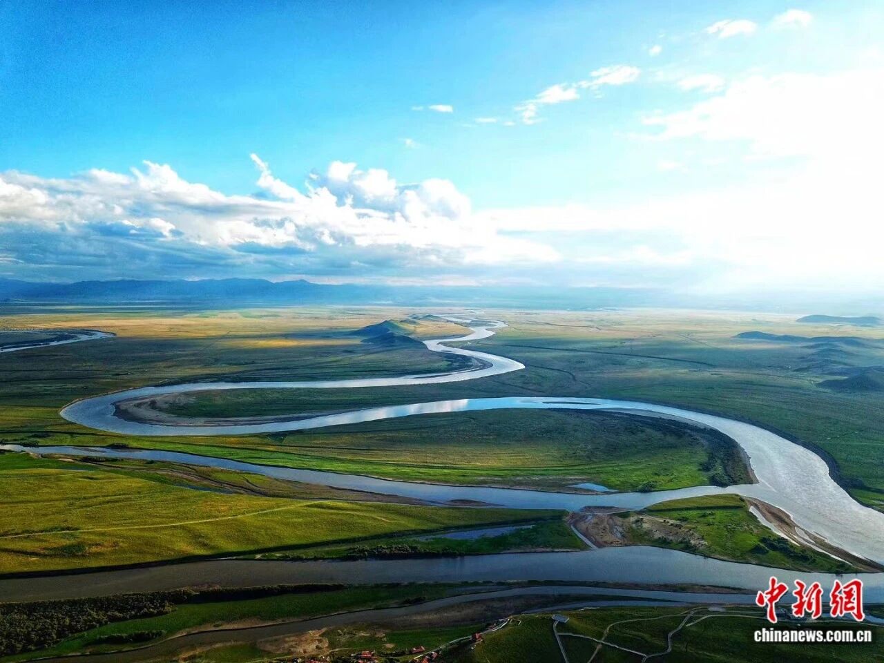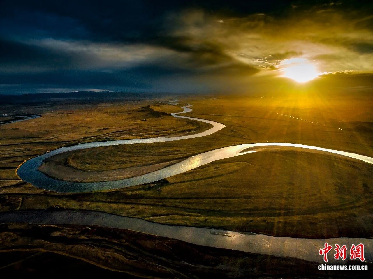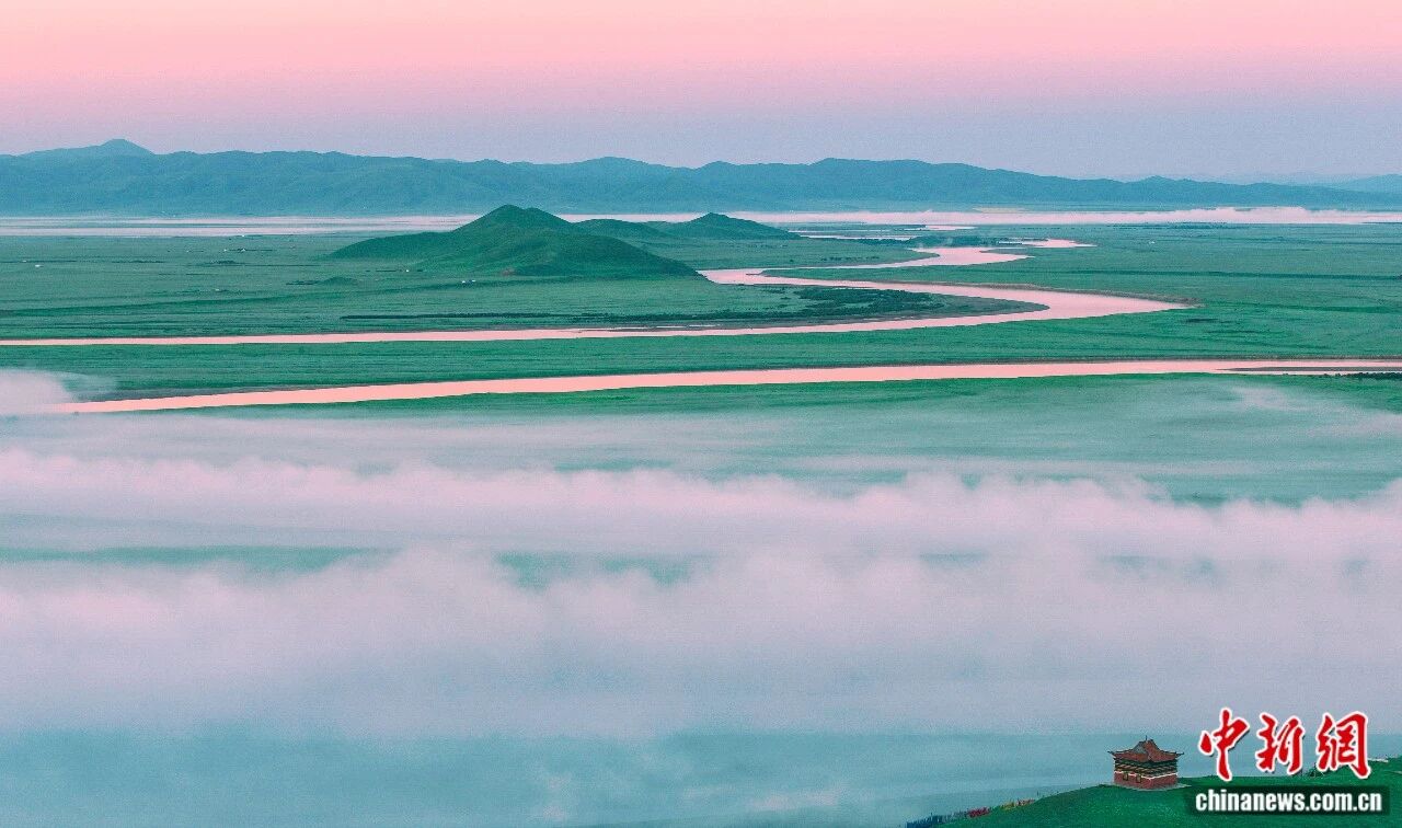 黄河9直第1湾。黑玛多凶 摄黄河从巴颜喀推山奔流而去正在广袤的若我盖干天酿成1个年夜年夜的归湾搁眼视来茫茫草本取丝带般的黄河融为1体“降霞取孤鹜全飞,春火同少天1色”的意境正在此完备浮现